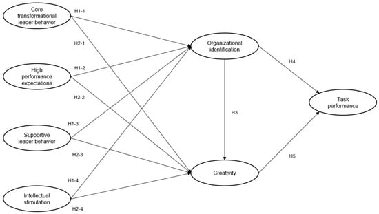 Leaders who intellectually stimulate employees are likely to have a positive impact on the employees. When leaders create and nurture a culture that allows employees to try an experimental approach, the employees are likely to come up with new ideas []. When employees are allowed to share their perspectives and ideas and contribute to improving the organization’s performance, they will feel they are part of the organization and develop a bond with the organization [,,]. In summary, this study proposes that the four dimensions of transformational leadership will have a positive impact on the employees (i.e., organizational identification). The following hypotheses are presented.