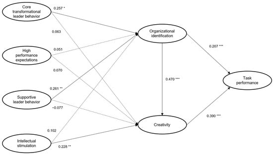 All items were measured with multiple items adopted from previous studies. The measures were anchored by 1 (strongly disagree) and 7 (strongly agree). Transformational leadership consisted of four dimensions including core transformational leader behavior (three items), high-performance expectations (two items), supportive leader behavior (five items), and intellectual stimulation (four items). These measures were adopted from the Lee et al.’s [] study. Organizational identification was measured with four items adopted from the Amundsen’s [] study. The study used four items to measure creativity and they were adopted from the Tsai et al. []’s study. Finally, task performance was measured with five items adopted from the Yang et al. []’s study.