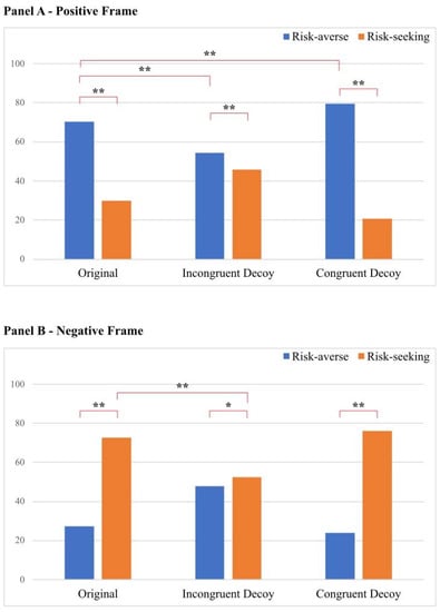 The present findings bring a novel overview of how the congruent decoy influences the framing effect, which is something that, to the best of our knowledge, was never investigated before. On the one side, by adding the CD option, we found an increase of 9.1% in the framing effect in the positive frame condition. On the other side, no significant difference was found in the negative frame condition when the CD option was added. We do not have a univocal explanation for this finding. Future studies should replicate and extend this difference between the positively and negatively framed scenarios when a CD option is added. However, we noted that the negative CD condition was one of the conditions with a higher number (12.4%) of decoy responses (i.e., the number of responses when the decoy option was selected). Specifically, we found that the irrational choice of selecting a decoy response occurred more often when the decoy was framed as a risk-seeking alternative compared to when it was framed as a risk-averse alternative. Therefore, we can hypothesize that adding the CD in the negative frame condition (i.e., a further risk-seeking alternative) might not make the choice easier for respondents. This possible view is in line with research pointing out that the modality of presentation of the decoy can have a substantial role in influencing the choice [53,54]. As previously discussed, both the decoy and the framing effect have been separately investigated to assess how psychological and social contextual factors can affect their decision bias. However, no framework has yet been established to understand their interaction and potentially assess how different contextual factors can influence their relationship. For this reason, future work should aim at understanding the underlying processes resulting in the decoy congruency and incongruency effect on the framing. Additionally, future investigations should compare the role of the decoy in the risky choice framing with other types of framing mechanisms such as attribute framing and goal framing [6].