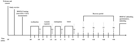 Cortisol, a marker of HPA activity, was measured in saliva and sampled 8 times over the course of the experimental protocol: baseline (T1, immediately following a 10-min acclimation period and before acoustic listening), following acoustic exposure (T2, immediately following 10-min acoustic listening), following anticipation (T3, following 5-min anticipation and before the speech/arithmetic task), TSST (T4, immediately following the 10-min speech/arithmetic task), and recovery (T5-T8, each at 10-min intervals following T4). Using the passive drool method, samples were collected in 2 mL polypropylene cryovials (Salimetrics, LCC, Carlsbad, CA, USA). Samples were stored in a −70 °C freezer until subsequent in-house analysis using Salimetrics© salivary cortisol enzyme competitive immunoassay standard 96-well plate assay kit. Inter- and intraassay coefficients of variation were 13.8%, and 4.7%, respectively.