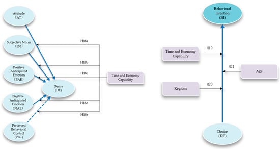 This study conducted multiple-group invariance analyses to test the moderating effects of Time and Economy capability on the relationships between five predictor variables (AT, SN, PAE, NAE, PBC) and desire (DE), as well as the moderating effects of Time and Economy capability, age, and region on the relationships between desire (DE) and behavioral intention (BI). In this research, the sample was categorized into two age groups (older and younger), three Time and Economy capability groups (high, common, low), and two region groups (key regions and non-key regions). Age, Time and Economy capability, and region acted as moderators in the analyses. Five out of six hypothesized paths (H18a, H18b, H18c, H18d, H19) for the Time and Economy capability groups and the two hypotheses (H20, H21) for age and region groups were found to be significantly moderated.