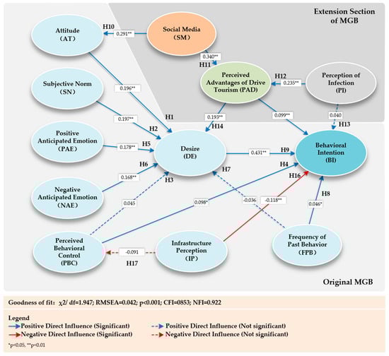 In Table 3, the MGB model had a good fit to the data (χ2 = 903.534, df = 369, p < 0.001, RESEA = 0.052, CFI = 0.930, NFI = 0.888). In contrast, the EMGB provided richer information in explaining behavioral intentions in RV tourism, in which the R2 of behavioral intentions and desires was significantly higher than that of the MGB model and was able to explain more behavioral intention variations, thus predicting an individual’s behavioral desires and behavioral intentions more accurately. In addition, EMGB showed an excellent fit to the data (χ2 = 2351.4, df = 1208, p < 0.001, RESEA = 0.042, CFI = 0.922, NFI = 0.853), which was close to the minimum values of criteria suggested by Hair et al. (2009) [], further validating its superiority relative to the MGB model. In summary, the results of this study indicate that the EMGB model is superior to the MGB model in explaining both behavioral desires and behavioral intentions in RV tourism and shows higher explanatory power and goodness-of-fit in predicting behavioral intentions.