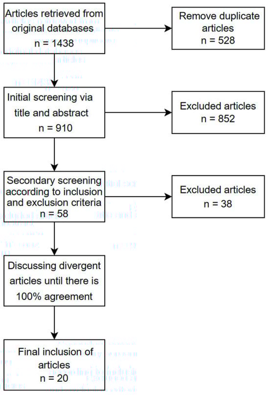After the database search, an initial screening of the literature was completed based on the title and abstract, and papers that did not include VR and ASD were initially excluded. When the information provided by the title and abstract was insufficient for exclusion, we retained articles first. After discussion and consensus, 852 articles were removed and 58 were included. A comprehensive review of these 58 articles was conducted in the second round of screening. After screening the articles based on the inclusion and exclusion criteria, 38 articles were excluded, and a total of 20 articles were added to a Microsoft Excel spreadsheet for coding, coding each article in terms of the following variables: (1) the number of topics, (2) background information about the experimental subjects (gender, age, etc.), (3) the VR device utilized, (4) the level of immersion in VR, (5) the intervention goals, (6) the maintenance and generalization of the learned skills, (7) the number and duration of the interventions. Two authors participated in the review and coding process, and, if there was disagreement between the coders during the screening process, to achieve a consistent outcome, they consulted one another and sought an expert’s opinion before making a decision. The literature screening process is shown below (Figure 1).