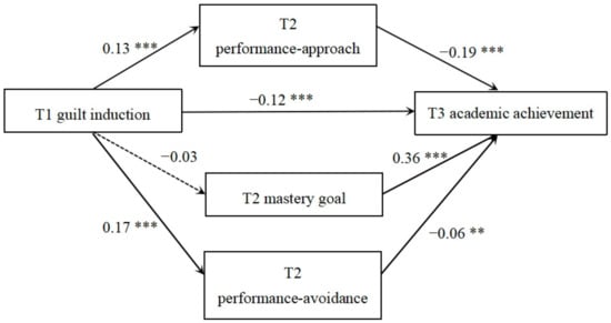 Longitudinal mediating model of guilt induction and academic achievement. Note: ** p < 0.01, *** p < 0.001.