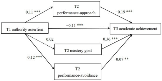 Longitudinal mediating model of authority assertion and academic achievement. Note: ** p < 0.01, *** p < 0.001.