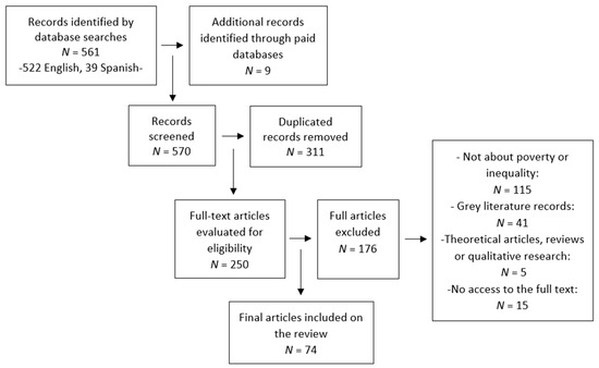 During the selection process (see Figure 2), some articles were discarded in line with the following exclusion criteria: unpublished undergraduate and graduate theses, conference papers, qualitative studies and papers that did not use scales to measure the construct. For the search referring to inequality, we also excluded any articles referring to gender inequality and other types of inequality beyond economic, wealth, and income inequality. Finally, a list of 74 articles was obtained, of which 63 were written in English and 11 in Spanish.