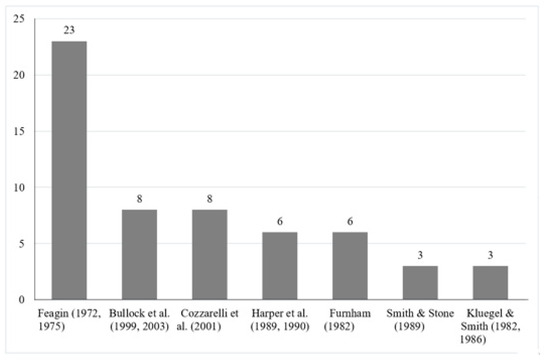 Only six studies took a more global perspective by employing the Causes of Third-World Poverty Questionnaire developed by Harper and colleagues [32], who also developed their items based on Feagin [10]. Eight studies employed the Attributions for Poverty Scale by Cozzarelli et al. [26], which was based on Smith and Stone [37]. This scale places particular emphasis on the cultural aspect of poverty. Another eight studies opted for the Attributions for Poverty Questionnaire [29,30], which also drew inspiration from Cozzarelli et al., and Furnham [26,31]. Furnham’s measure was employed six times by different authors [31]. Three works used the Attributions for Poverty Questionnaire by Kluegel and Smith [35,36]; they employed a version of Furnham’s questionnaire [31] in addition to Feagin’s scale [10]. Furthermore, another three studies employed the Beliefs About Poverty Scale designed by Smith and Stone [37] based on both Feagin [34] and Kluegel and Smith [35,36]. Finally, two studies opted for the scale designed by van Oorschot and Halman [50], who drew inspiration from Kluegel and Smith [35,36].
