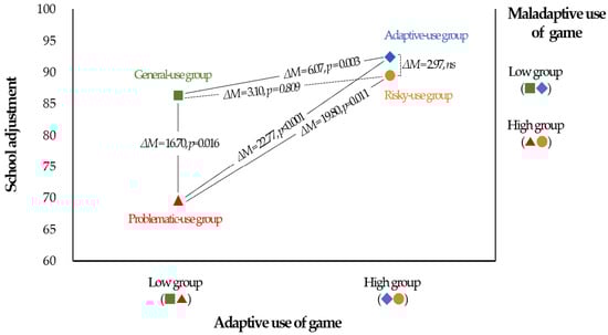 The results of the Tukey HSD post hoc test are depicted in Figure 1, along with the mean values of the gaming behavior group. In the two groups with the low maladaptive use of games (adaptive-use and general-use groups), school adaptation was very high. The highest school adjustment score was obtained when high adaptive use occurred together with low maladaptive use (the adaptive-use group). However, even if the maladaptive use of the game was high, not all exhibited low school adaptation, confirming the interaction effect between gaming behaviors. In other words, school adjustment was high in cases where the maladaptive use of games was high, but adaptive use was also high (the risky-use group). However, the lowest school adjustment is observed in the case of low adaptive use and high maladaptive use (the problematic-use group). Although the maladaptive use of games was high, school adjustment was very high when the adaptive use of games was also high. There was no statistically significant difference between the risk-use group and the normal- or adaptive-use groups.
