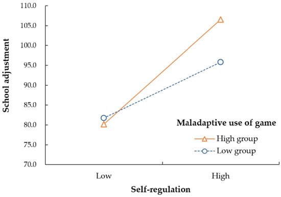 The results revealed a significant moderating effect of self-regulation on the negative impact of maladaptive adolescent gaming use on school adjustment. This finding highlights the importance of self-regulation in reducing maladaptive gaming among adolescents. Similar to the findings of this study, previous studies have also reported that game users’ self-regulatory tendencies have a moderating effect on excessive games []. Self-regulation is a higher-order concept of self-control [], and failures in self-regulation have been linked to eating disorders, drugs, and gambling addictions []. Furthermore, high self-regulation is a protective factor against gaming over-engagement [,]. This suggests that self-regulation is an important protective factor against maladaptive gaming use among adolescents. In particular, the effect of self-regulation on school adjustment was stronger among adolescents with maladaptive gaming use, suggesting that self-regulation may be an alternative to maladaptive gaming.