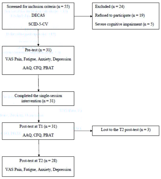 Design and procedure. The present study is an uncontrolled trial, comprising an intervention group with no control arm. The participant flow is depicted in Figure 1. A quasi-experimental design was used, all participants fulfilling the inclusion criteria being further involved in the intervention. A convenience sampling was applied, relying on the patients’ agreement and willingness to participate in this research. The screening involved the DECAS Personality Inventory. More specifically, the composite T scores for the Emotional Stability (Neuroticism) subscale were extracted for each participant by using the DECAS online platform []. Participants that scored lower than the normative level based on their age and gender in Emotional Stability were considered for further screening. This initial assessment was doubled by the application of the SCID-5-CV—generalized anxiety disorder and major depressive disorder sections. Participants who met the criteria for one or both diagnoses were included in the study. A total number of 31 participants were enrolled and completed the SSI, based on established techniques and protocols of PB-CBT for chronic pain [,,]. The intervention was carried out at the bedside, in an individual format, within two days after the hospital admission and lasted between 70 and 80 min. So far, SSI interventions had a highly variable duration between 40–50 min [] and 8 h [,]. However, many of these programs were delivered in a workshop format, in different settings and enrolled participants with diverse diagnoses. Thus, the SSI applied in our study considered the optimal length for an individual session within the in-patient context, where participants underwent a multimodal treatment involving medical and physical therapy as first-line treatments, as well as the potential constraints related to the attention span and concentration ability which characterize chronic pain conditions []. The SSI consisted in four major components, each lasting for about 15–20 min. The first part involved a psychoeducation about the tendency to engage in experiential avoidance as a response to pain, withdrawing from many meaningful activities, or preventing the experience of difficult sensations or emotions. The ways in which avoidance could occur in daily living was discussed with patients, who were asked to think about personal examples. The second step used a mindfulness technique, providing a healthier way for patients to cope with unpleasant feelings. After a brief description of the body scan approach, the exercise was performed, requiring participants to close their eyes, start to focus on their breath and then on each bodily part, only noticing sensations, without evaluating them in any way. The third part introduced cognitive fusion as a dysfunctional way of dealing with negative thoughts that increases distress. Cognitive defusion was explained with the help of metaphors (e.g., thoughts could be seen as clouds in the sky or people passing by the street). The practical exercise used a guided imagery script in which patients were encouraged to visualize a landscape of streaming water, along with their thoughts on floating leaves, just observing them from the edge. The fourth component was related to the concept of personal values and applied a simple comparison between significant life areas and the energy sources of a recharging battery to help participants understand the role of meaningful action in motivation and subject wellbeing. The session ended with an action plan that integrated up to five behavioral goals for the upcoming month, which were established in a collaborative way with patients, according to the previously identified life values. The steps of the single-session protocol are presented in Table 2. The pre-test involved the administration of a brief demographic questionnaire, the VAS scales for pain, fatigue, anxiety and depression, as well as the evaluation of psychological flexibility processes with the AAQ, CFQ and PBAT, respectively. The post-test at T1 was conducted after 3–5 days following the intervention, including the use of AAQ and CFQ scales. The post-test at T2 was conducted telephonically at one month after the hospital admission, asking participants to evaluate the intensities of pain, fatigue, anxiety and depression during the previous two weeks using the VAS scales. The selection of variables for the T1 and T2 assessment relies on the research indicating the classification of experiential avoidance, cognitive fusion and behavioral variables as dynamic states, while highlighting the relative stability of physical and emotional functioning components [,,]. Also, the instruments implemented in the present study allowed for the evaluation of T1 variables immediately after the intervention, while the T2 measures required a longer time span between the prior and post-assessment. The contextual discrepancy between T1 and T2 was another aspect contributing to the selection of the VAS scales only for the one-month telephonic administration. Based on past studies showing a strong correlation between psychological inflexibility and functional variables, we assumed a pattern of interdependent relationships between cognitive fusion, experiential avoidance, dysfunctional behaviors, perceived pain and emotional disorders, especially given the post-pandemic context [].
