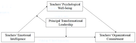 PWB can have a positive implication on OC. According to the broaden-and-build theory of positive emotions [,], positive emotions (e.g., the experience of PWB) can expand one’s repertoire of thoughts and actions, which, in turn, can foster enduring personal resources, leading to positive attitudes, cognitions, and behaviors. When applied to the workplace, the manifestation of these positive emotions can transform employees’ perceptions of their work, viewing it as a “calling” rather than merely a job [,]. Consequently, employees build emotional bonds with their organizations, strongly identify with organization goals, and express a desire to remain part of the organization [,,], all of which constitute key elements of OC. While empirical studies outside the realm of education have confirmed a positive association between employees’ PWB and OC [,], research focusing specifically on the relationship within the school context remains limited, albeit with notable exceptions. For example, by collecting data from 346 high school teachers, Heidari et al. found that differences in teachers’ PWB could explain the variations in their OC []. Synthesizing these arguments, it stands to reason that more emotionally intelligent teachers—who adeptly perceive, process, and manage their own emotions and those of others—will experience higher levels of PWB, and the positive emotions prompted by PWB, in turn, will enhance their commitment to their respective schools. Therefore, we posit the following: