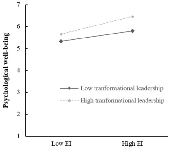 Third, this study demonstrated that PTL positively moderated the relationship between teachers’ EI and PWB. Specifically, resonant with the trait activation theory [], higher levels of reported PLT among teachers correspond to an increased activation of emotion-related capabilities through relevant cues, thereby facilitating the maintenance of high levels of PWB. That is to say, the positive effect of teachers’ EI on PWB is enhanced in schools with transformational leaders. In contrast, lower levels of reported PLT among teachers are associated with feelings of diminished care and support, resulting in less frequent experiences of positive emotions, and thus attenuating the positive role of EI in reaching high levels of PWB. The result echoes previous studies and arguments on the importance of environmental conditions in linking employees’ EI to individual outcomes [,,], as well as the prominent role of transformational leadership in school settings [], establishing PTL as an important boundary condition for the effect of teachers’ EI on PWB. Transformational school leaders, being highly considerate, visionary, and encouraging, increase the likelihood of teachers experiencing positive emotions, feeling personal accomplishment, and maintaining psychological health [,]. According to Arnold’s systematic review, a large amount of empirical research has proved that transformational leadership can directly predict followers’ PWB []. Our study goes further, to reveal that in the educational context, transformational leadership can interact with teachers’ EI to jointly enhance their PWB.