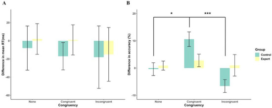 Figure 4B illustrates the results of the ANOVA on difference in accuracy between post-error trials and post-correct trials, indicating a significant main effect of Congruency (F(1.82, 82.80) = 6.26, p = 0.004, = 0.12) and a significant Group × Congruency interaction (F(1.82, 82.80) = 4.06, p = 0.021, = 0.08). Bonferroni-adjusted post-hoc multiple comparisons showed that for control participants, the difference in accuracy between post-error trials and post-correct trials in the congruent condition was higher than that in the other two conditions (p < 0.016). In contrast, for experts, no significant differences were observed across the three congruency conditions (p > 0.90). The main effect of Group was non-significant (F(1, 44) = 0.06, p = 0.82).