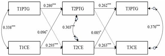 Cross-lagged analysis of post-traumatic growth and cognitive empathy. Note: *** denotes p < 0.001; * denotes p < 0.05; PTG = post-traumatic growth, CE = cognitive empathy. (In the model, solid lines indicate significant standardized path coefficients, while dashed lines represent non-significant path coefficients. For clarity, path coefficients related to control variables have been omitted from the visual representation).