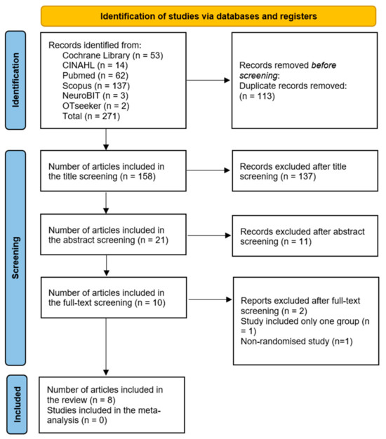 The flowchart based on the PRISMA guidelines (Figure 1) illustrates the results of the search process and study selection phases. Initially, 271 studies were identified from the six databases. Eight trials met the inclusion criteria and were included in the review after removing duplicates and screening the titles, abstracts, and full texts.