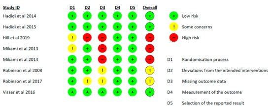 - Sterne, J.A.; Savović, J.; Page, M.J.; Elbers, R.G.; Blencowe, N.S.; Boutron, I.; Cates, C.J.; Cheng, H.Y.; Corbett, M.S.; Eldridge, S.M.; et al. RoB 2: A revised tool for assessing risk of bias in randomised trials. BMJ 2019, 366, l4898. [Google Scholar] [CrossRef] [PubMed]