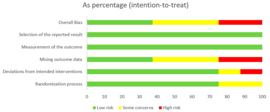 The distribution of the risk of bias across the studies is shown in Figure 3. Two studies had a high risk of bias, two studies were rated with some concerns, and three studies had a low risk of bias. These studies were graded into three domains: missing outcome data, deviations from the intended interventions, and randomization process. Regarding the measurement of the outcome and selection of the reported result criteria, all eight studies were assessed as having a low risk of bias. Both studies with high risks of bias and three studies with some concerns had missing data that could affect the results.