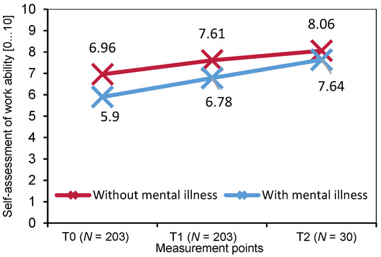 Work ability was rated as significantly higher after than before coaching: Multivariate Analysis of Variance (MANOVA) shows significant mean differences between T0 and T1 with a small effect size (MT0 = 6.50, MT1 = 7.22; F(202) = 8.23, p = 0.005, η2 = 0.040, Figure 1). In the MANOVA for participants with full follow-up data (T0-T2), the effect is no longer visible (MT2 = 7.90, F(29) = 0.60, p = 0.551, η2 = 0.023, Figure 1). Pairwise comparisons show a significant difference in work ability between T0 and T2 (MDiff = 1.03, 95%-CI [0.27, 1.80], p = 0.005, N = 30) but not between T1 and T2 (MDiff = 0.07, 95%-CI [−0.64, 0.78], p = 1.00, N = 30). Gender (F(1,202) = 0.14, p = 0.709, η2 = 0.001), age (F(1,202) = 2.48, p = 0.117, η2 = 0.012), and mental health status (F(1,202) = 2.06, p = 0.152, η2 = 0.010) show no interaction with work ability over time (Figure 1).