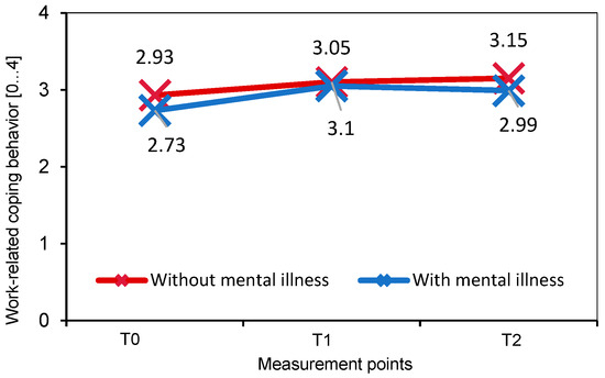 For work-related coping behavior, variance analysis with repeated measurement (without control variables) shows significant mean differences in the pre–post comparison (T0-T1) with a large effect size (MT0 = 2.82, MT1 = 3.08, F(1,202) = 60.20, p < 0.001, η2 = 0.232; Figure 3). Including the control variables gender, age, and mental health status, the ANCOVA yields no significant mean differences between T0 and T1 (MT 0= 2.82, MT1 = 3.08, F(1,202) = 3.02, p = 0.084, η2 = 0.015; Figure 3). For mental health status, there is the tendency towards an interaction effect (F(1,202) = 6.33, p = 0.013, η2 = 0.031): At the beginning of the coaching (T0), participants with mental illness showed significantly lower coping behavior than participants without mental illness (F(1,202) = 7.33, p = 0.007). After coaching (T1), the groups no longer differed significantly from one another (F(1,202) = 0.38, p = 0.541).