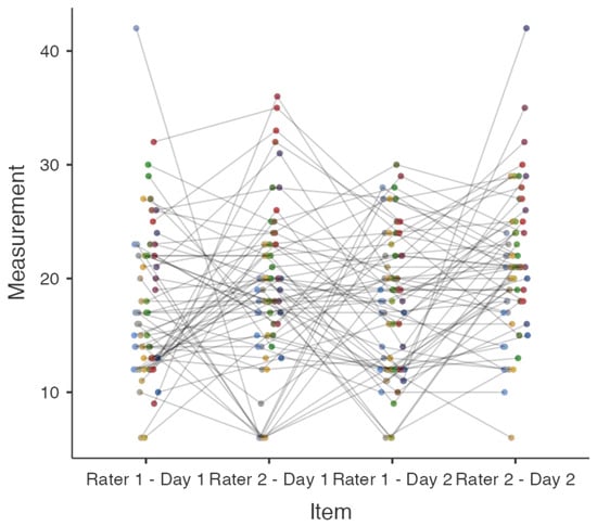 MTMTI reliability plot for Days 1 and 2 between raters. Different colored circles represent individual participants. Each color is assigned to a unique participant, allowing for a clear visual distinction between the data points corresponding to each participant’s responses on Days 1 and 2.