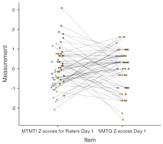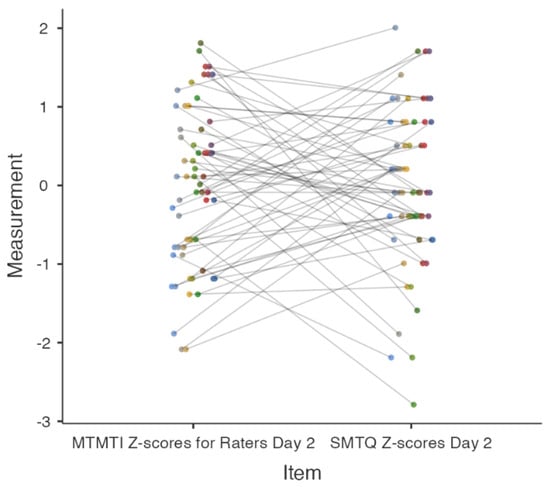 Figure 3 and Figure 4 present the concurrent validity results, underscoring the weak correlations and low reliability between the MTMTI and SMTQ. On Day 1, inventory scores were negatively correlated (r = −0.09, p = 0.5), while on Day 2, they were positively correlated (r = 0.1, p = 0.5). The reliability agreement on Day 1 was extremely poor (ICC2k < 0.001, 95%CI [−0.53, 0.35]) (Figure 3). On Day 2, reliability improved but remained relatively low (ICC2k = 0.13, 95%CI [−0.33, 0.43]) (Figure 4). Cohen’s κ for both days indicated no agreement between the inventory scores (k < 0.001).