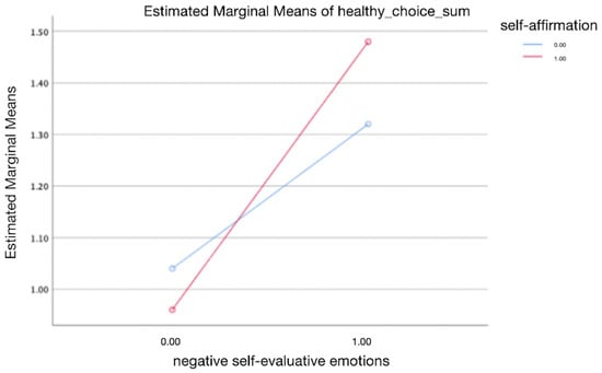 However, most studies examined the effects of self-affirmation on cognition (e.g., attitudes) and proximal behavior (e.g., intentions) rather than on behaviors in the real world []. Additionally, although a meta-analysis discovered that self-affirmation manipulations had an average behavioral effect on responses to threatening information [], the effects of self-affirmation are relatively modest and heterogeneous [,]. Moreover, fewer studies have examined how self-affirmation may exacerbate or buffer the relationship between negative self-evaluative emotions and healthy food choices [,,,,]. Therefore, a secondary aim of the present study was to examine whether self-affirmation moderated the relationship between negative self-evaluative emotions and healthy food choices.