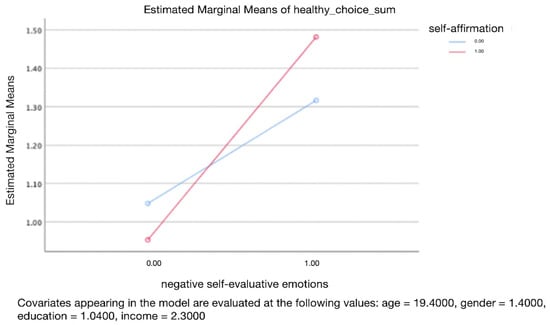 A two-way ANOVA was conducted that examined the effects of negative self-evaluative emotions and self-affirmation on healthy food choices, particularly testing the hypothesis that greater negative self-evaluative emotions are associated with increased healthy food choices. Our dependent variable, healthy food choice, was normally distributed for the groups formed by the combination of the levels of negative self-evaluative emotions and self-affirmation as assessed by the Skewness and Kurtosi test. There was homogeneity of variance between groups as assessed by Levene’s test for equality of error variances. Results revealed that negative self-evaluative emotions have a significant and positive impact on healthy food choices (F(1, 96) = 8.807, p = 0.004, see Figure 1). However, there is no significant interaction between the effects of self-affirmation and negative self-evaluative emotions on healthy food choices (F(1, 96) = 0.793, p = 0.376, see Figure 1). Further analysis, controlling for demographic variables including age, gender, education levels, and monthly income, yielded consistent results, no significant interaction was observed (F(1, 96) = 0.796, p = 0.375, see Figure 2), but there is still a significant and positive impact of the negative self-evaluative emotions on healthy food choices (F(1, 96) = 6.938, p = 0.01, see Figure 2).