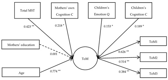 To investigate the relationship between mothers’ MST and children’s ToM, this study first conducted a confirmatory factor analysis to determine the factor structure of ToM. As the model was a saturated model, i.e., all parameters to be estimated were exactly equal to the elements in the covariance matrix with zero degrees of freedom, the fit indices were no longer estimated, and only the path coefficients were considered. All items loaded significantly, with standardized factor loading coefficients ranging from 0.406 to 0.657. In our model, we included the latent factors of ToM as outcome variables.