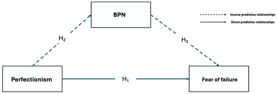 Following the reviewed literature, the present paper aims to explain how perceived satisfaction with BPNs mediates the relationship between perfectionism and fear of failure in a sample of young athletes playing team sports. Based on this, the hypothesized model (see Figure 1) expects to find that perfectionism will show a direct and positive relationship with fear of making mistakes (H1), while the mediation of satisfaction with BPNs will exert an indirect and protective effect on the negative effects of perfectionism (H2) and reduce the fear of making mistakes (H3).