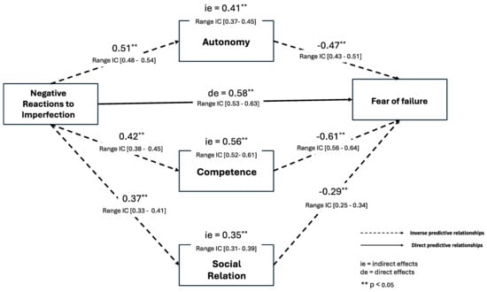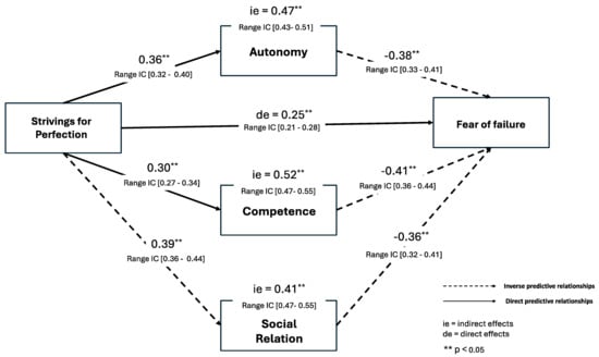The results confirmed that BPNs mediate the relationship between perfectionism and fear of failure (β = 32.4; p < 0.01), with a significant indirect effect (β = 0.18; p < 0.01). The mediation model test also worked for BPNs separately on BPNs (see Figure 2 and Figure 3), with the significant indirect effects to Striving to Perfection [Autonomy (β = 0.47; p < 0.01), Competence (β = 0.52; p < 0.01), and Social Relation (β = 0.41; p < 0.01)] and to Negative Reactions to Imperfection [Autonomy (β = 0.41; p < 0.01), Social Relation (β = 0.56; p < 0.01), and Competence (β = 0.35; p < 0.01)].