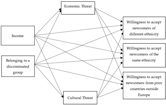 The literature review showed that the local European population, either native-born or immigrant, may be competing or complementary to newcomers, namely, may be harmed or, on the contrary, benefit from the arrival of new immigrants [31]. These harms or benefits may be either economic or cultural. Belonging to a competing or complementary group is shaped by income or belonging to the discriminated group. Therefore, these two factors (income and belonging to the discriminated group) may predict economic and cultural threats from immigrants, and these threats, in turn, may predict willingness to accept newcomers. Thus, economic and cultural threats mediate relationships between income and belonging to discriminated groups, and willingness to accept newcomers of various groups. The willingness to accept newcomers may differ for various groups of newcomers; thus, willingness to accept three groups of newcomers will be examined: (1) newcomers of the same race or ethnic group as most of the country’s population; (2) newcomers of a different race or ethnic group than most of the country’s population; (3) newcomers from the poorer countries outside Europe.