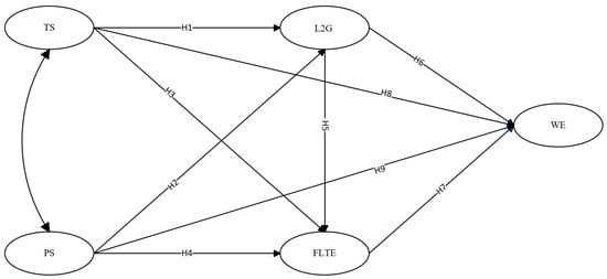The S-O-R model posits that various environmental factors can serve as stimuli that affect an individual’s internal condition, known as the organism, thereby eliciting specific behavioral reactions [15]. Within education, this theory underscores the significance of external stimuli in shaping students’ cognitive and emotional responses, which subsequently influence their learning behaviors and satisfaction [16,17]. The S-O-R framework is particularly suitable for this study for two main reasons. First, it has been extensively utilized in educational contexts. For example, Zhang et al. integrated the Social Cognitive Career Theory with the S-O-R model to examine the relationships among social support systems, interaction relationships, self-efficacy, generic skills, and learning satisfaction [18]. Ge et al. proposed a model of the influence of teacher support on learning persistence in MOOCs by combining the S-O-R model with the Technology Acceptance Model [19]. Second, the variables under investigation in this study align with the typical components of the S-O-R framework. Both teacher and peer support can enhance an individual’s performance or mitigate negative impacts [20], thereby serving as significant predictors of student self-efficacy and academic performance [21]. The L2 grit and FLTE of preservice teachers in this study represent positive emotions that cultivate an optimistic and growth-oriented mindset among EFL learners [22]. Work engagement reflects pre-service teachers’ passion, concentration, and effort in teaching work. It indicates individual intentional tendencies or actual behaviors, essentially representing a coping response to external stimuli. Therefore, this study regards the pre-service EFL teachers’ perceived teacher support and peer support as stimuli, views the pre-service teachers’ L2 grit and foreign language teaching enjoyment as internal organismic states, and takes their work engagement as the response. By constructing a SOR predictive model for pre-service teachers’ work engagement, the study strives to explore the impact of teacher support and peer support on pre-service teachers’ work engagement, as well as the mediating roles of psychological emotions such as pre-service teachers’ L2 grit and foreign language teaching enjoyment.