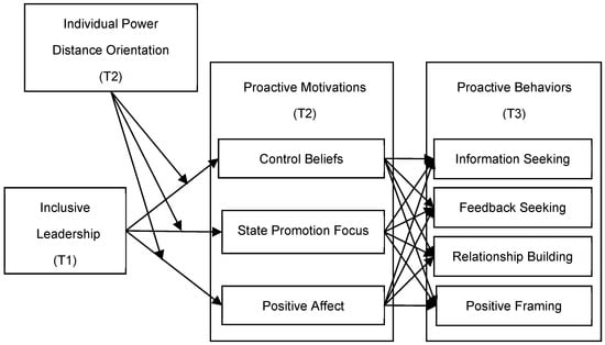 To address these gaps in the literature and elucidate the relationship between newcomers’ proactivity and the work environment, we focused specifically on the role of inclusive leadership—a crucial organizational contextual variable—in promoting such behaviors. This notion is particularly relevant to the generation of newcomers who make up the majority of the workforce because the new generation desires to belong and be recognized by the organization, while also expecting the organization to appreciate their uniqueness and encourage them to excel (; ). Inclusive leadership is often assumed to satisfy their demands and lead to favorable modifications in behaviors (). More importantly, we also explain the mechanism of inclusive leadership affecting newcomers’ proactive behaviors. Based on the proactive motivation model (), we examined the mediating role of three proactive motivational states: control beliefs (representing the can-do motivation), state promotion focus (representing the reason-to motivation), and positive affect (representing the energized-to motivation) in the relationship between inclusive leadership and newcomers’ proactive behaviors. In addition, we further examine the moderating effect of newcomers’ power distance orientation () within this process.