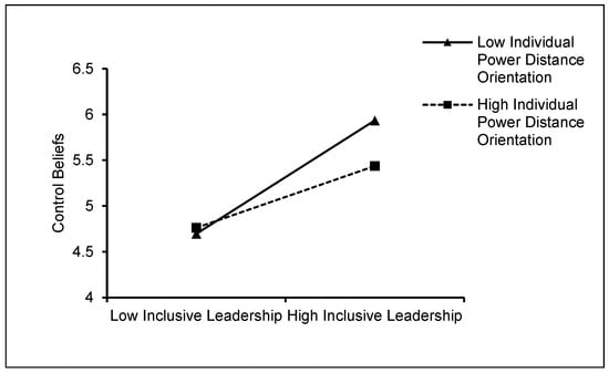 Individual power distance orientation moderates the positive effect of inclusive leadership on newcomers’ control beliefs. The positive effect is stronger when the power distance orientation is low than when it is high.