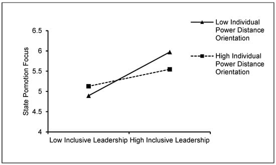 Individual power distance orientation moderates the positive effect of inclusive leadership on newcomers’ state promotion focus. The positive effect is stronger when the power distance orientation is low than when it is high.