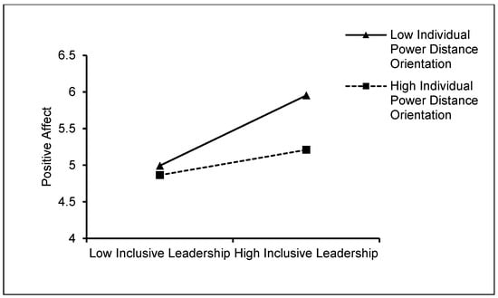 Individual power distance orientation moderates the positive effect of inclusive leadership on newcomers’ positive affect. The positive effect is stronger when the power distance orientation is low than when it is high.