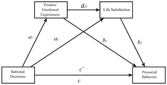 The proposed serial mediation model links rational decision-making to prosocial behavior through positive emotional experiences and life satisfaction. Note. a, b, c, c′, and d represent the path coefficients: a1 = effect of X on M1; a2 = effect of X on M2; b1 = effect of M1 on Y, controlling for the effects of X; b2 = effect of M2 on Y, by controlling for the effects of X and M1; d21 = effect of M1 on M2, controlling for X; c = total effect of X on Y, combining direct and indirect effects; c′ = represents the direct effect of X on Y, excluding any mediation through M1 or M2.