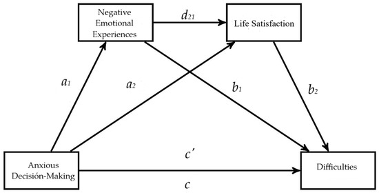 Anxious decision-making (X) indirectly influences difficulties in adolescents (Y) through the mediation of negative emotional experiences and life satisfaction. Specifically, greater anxious decision-making would be related to more negative emotional experiences (M1), which, in turn, would be related to lower life satisfaction (M2), which would ultimately be associated with higher difficulties.