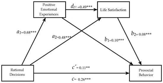 The total effect of rational decision-making on prosocial behavior was significant (c = R2 = 0.13, F(3,453) = 23.22, p < 0.0001, b = 0.25, SE = 0.36, 95% CI [0.18, 0.33]). The coefficient of the direct path between the two variables (c’ = 0.11, 95% CI [0.04, 0.18]) continued to emerge even after adding positive emotional experiences and life satisfaction as serial mediators. In the total effect of the variables on prosocial behavior, age (b = 0.16, SE = 0.07, t(3,453) = 2.11, p = 0.04, 95% CI [0.01, 0.32]) and gender (female, b = 0.75, SE = 0.20, t(3,453) = 3.58, p = 0.0009; 95% CI [0.33, 1.15]) were significant.