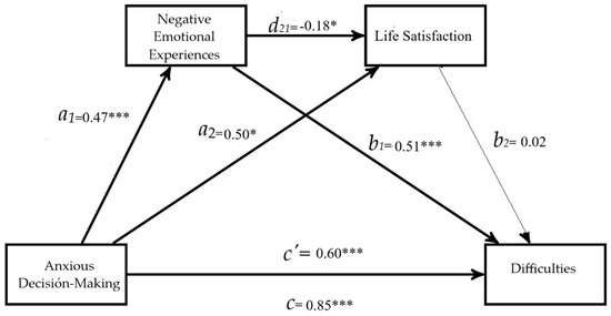 Results of the serial mediation (Model 6) with two mediators, negative emotional experiences and life satisfaction. Note. Coefficients are unstandardized. The total indirect effect 0.25, SE = 0.11, 95% CI [0.11, 0.41]. *** p < 0.001. * p < 0.05. The thin line represents regressions that are not significant. The path diagram with standardized coefficients is available in Supplementary Material C.
