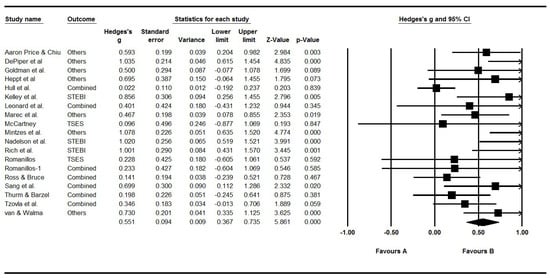 p ≤ 0.038; r = 0.22–0.48). Change-score comparisons between Yoga and SEL were not statistically different (