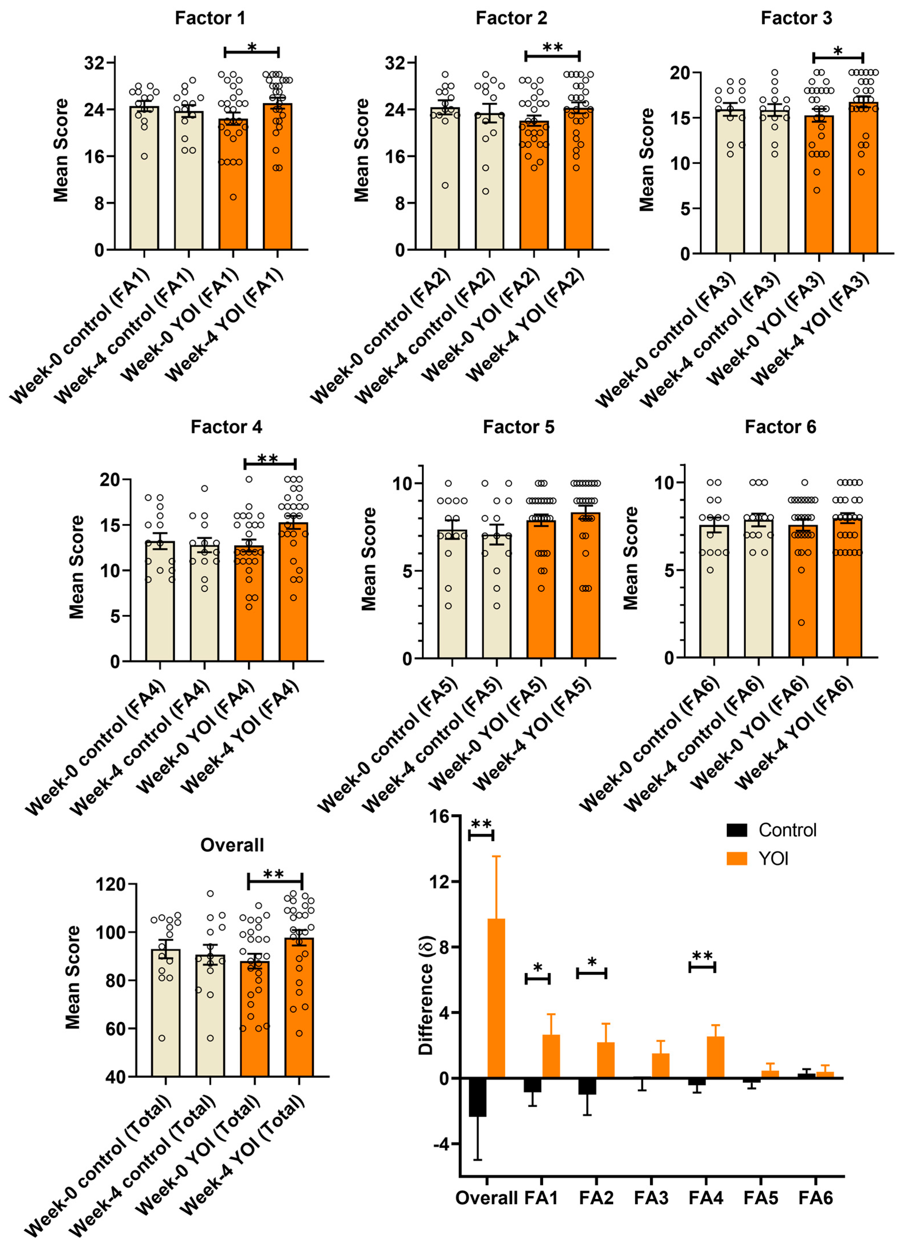 | Week 0 (Control) | Week 4 (Control) | p-Value | Week 0 (Pre-YOI) | Week 4 (Post-YOI) | p-Value | δ-Control | δ-YOI | p-Value | |