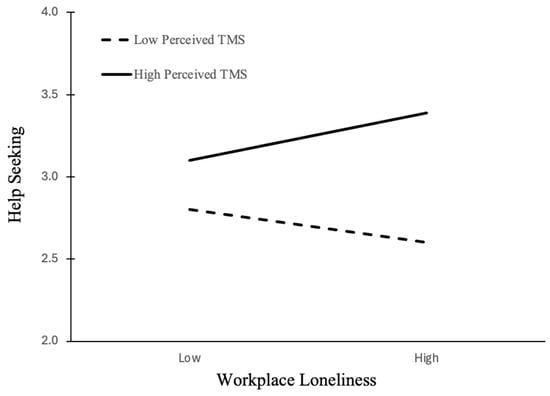 The moderation effect of perceived TMS on the relationship between workplace loneliness and help-seeking behavior. Notes: Workplace loneliness was positively associated with help-seeking when perceived TMS was high (I SD above the mean), but not when TMS was low. This suggests that perceived TMS can mitigate the negative effects of loneliness by facilitating adaptive engagement for help-seeking.