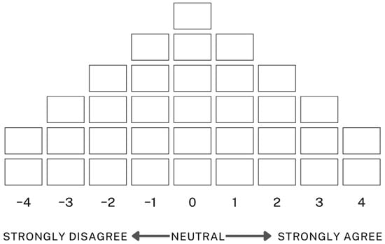 Participants conducted Q-sorting in person, with researchers directly explaining the procedure and method to each participant and remaining present throughout the entire process. Participants completed the Q-sort individually using a standardised distribution grid (see Figure 3) provided by the researchers. The grid followed a forced-choice distribution, a quasi-normal distribution ranging from −4 to +4, where participants sorted statements based on their degree of agreement or disagreement with each statement. This method allowed us to uncover each participant’s unique structure of subjectivity (). The forced distribution also ensured that participants could distinguish between statements meaningfully based on their relative importance.