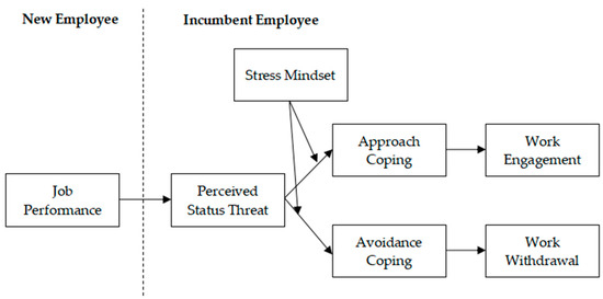 This research applies the stress appraisal framework to examine how perceived status threats, triggered by high-performing new employees, affect incumbent employees’ work engagement and withdrawal behaviors. The investigation proposes that coping approaches, specifically proactive adaptation strategies and disengagement tactics, serve as mediating mechanisms, with stress perception orientation playing a moderating role. By reversing traditional research perspectives to concentrate on incumbent employees rather than new employees, this analysis identifies the key drivers of perceived occupational vulnerability and investigates their behavioral consequences. Through a time-lagged research methodology, we garnered responses from 266 incumbent employees spanning multiple sectors. The results demonstrate a strong positive correlation between the competence of new employees and incumbent employees’ perceived status of threat, which subsequently elevates work engagement via approach-focused strategies, while simultaneously increasing disengagement behaviors through avoidance mechanisms. Notably, employees’ fundamental beliefs about stress significantly weaken the association between perceived competitive threats and passive coping methods. These discoveries highlight critical implications for managing workplace dynamics and optimizing team performance through an enhanced understanding of perceived status challenges.