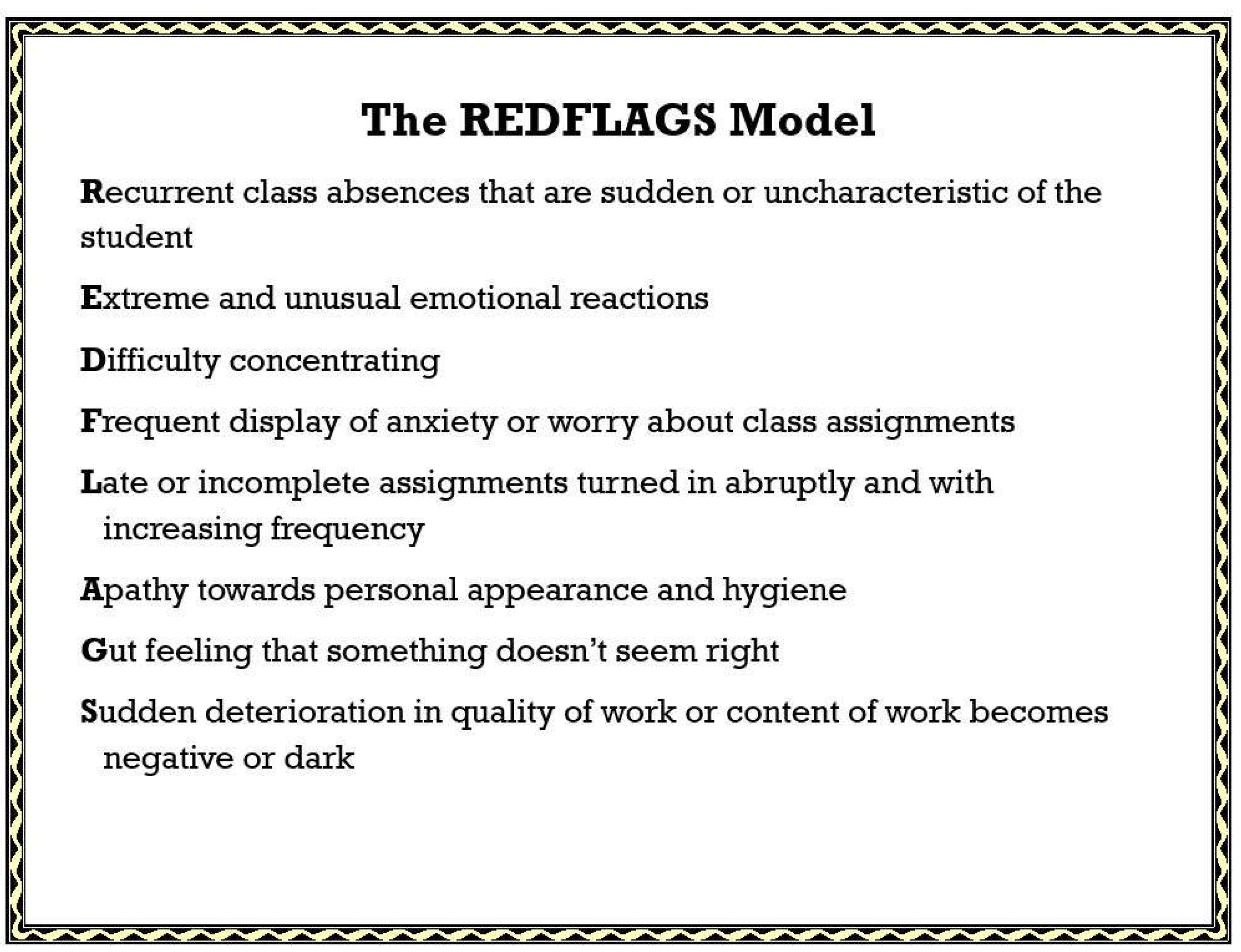 - Kalkbrenner, M. T., Brown, E. M., Carlisle, K. L., & Carlisle, R. M. (2019). Utility of The REDFLAGS Model for supporting community college student mental health: Implications for counselors. Journal of Counseling & Development, 97(4), 417–426. [Google Scholar] [CrossRef]
