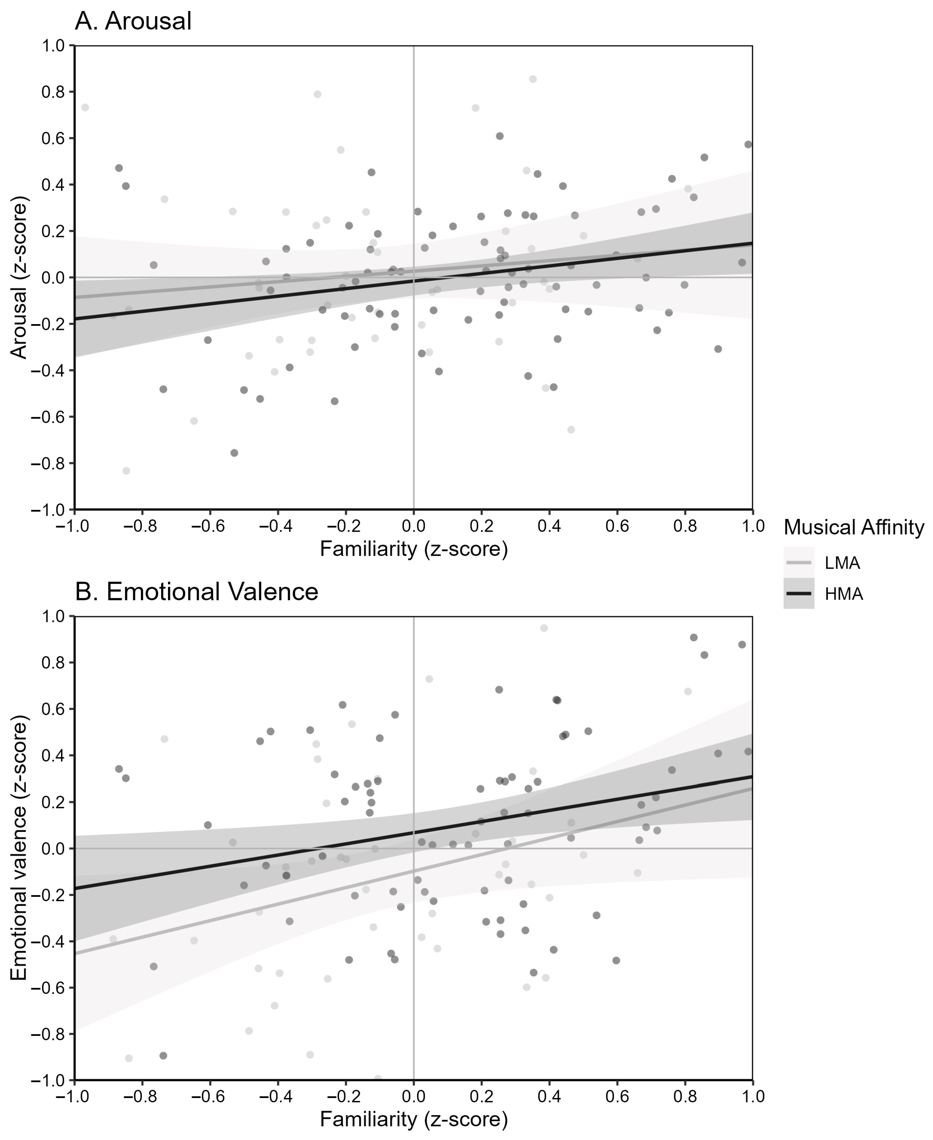 | Musical affinity × Familiarity | 5.64 | 1 | 131 | 0.019 * | 0.041 |