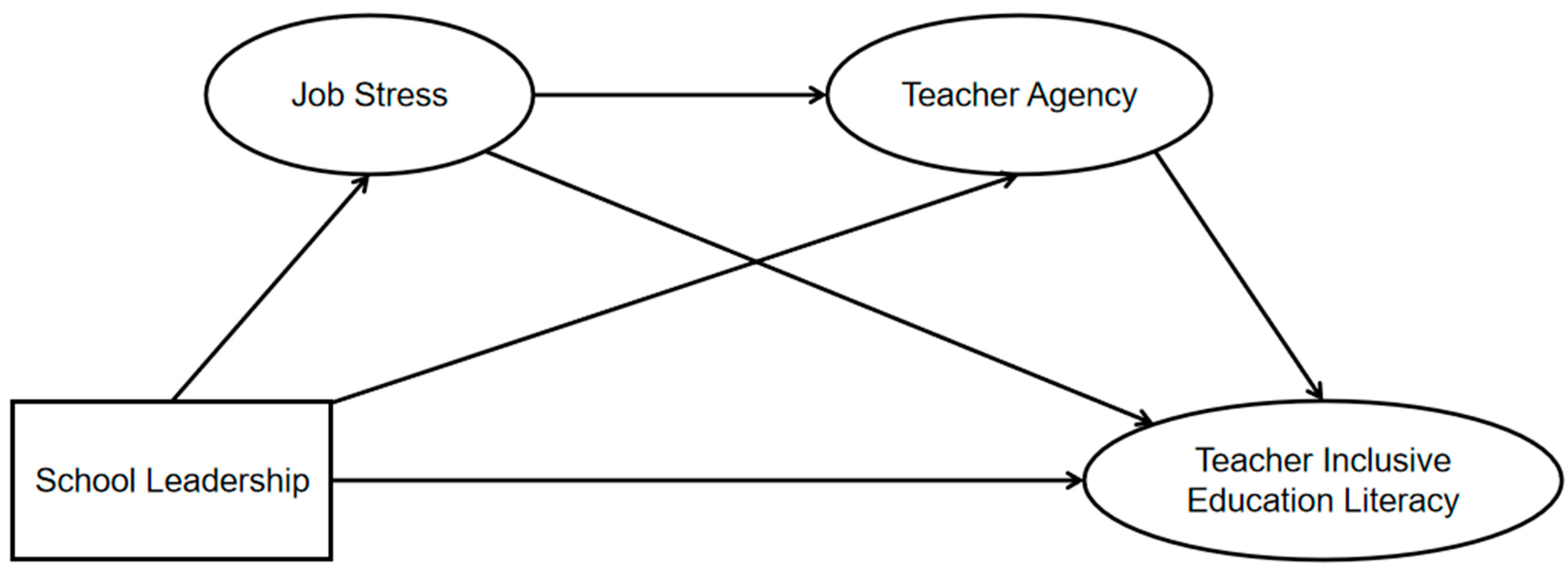 Chicago/Turabian StyleFeng, Yulu, Dan Zhou, and Yihong Wei. 2025. "The Impact of School Leadership on Inclusive Education Literacy: Examining the Sequential Mediation of Job Stress and Teacher Agency" Behavioral Sciences 15, no. 11: 1572. https://doi.org/10.3390/bs15111572