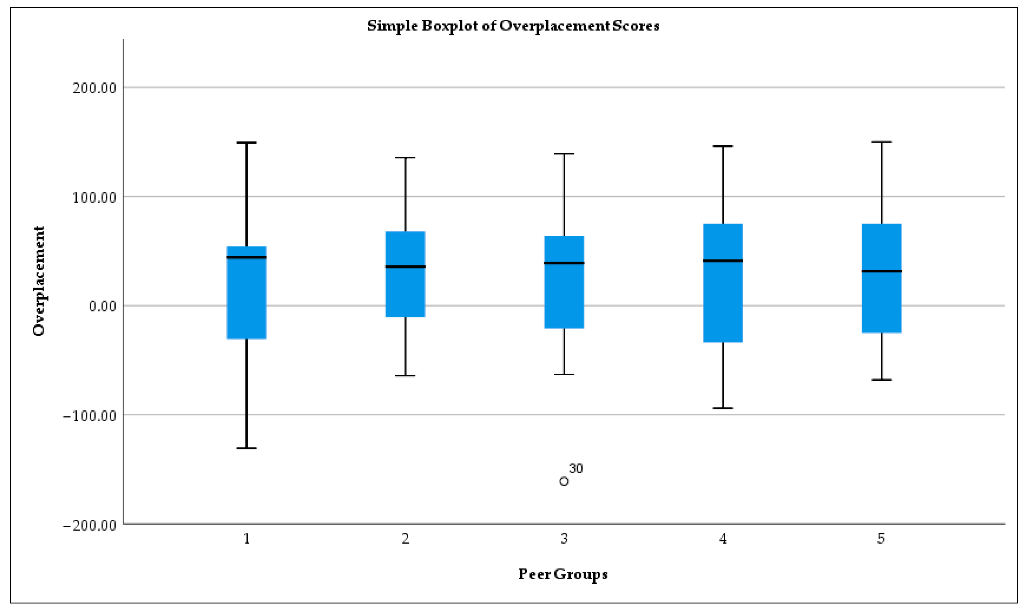 Among these peer groups, the lowest mean self-assessment score was 61, the lowest mean peer expectation score was 32, and the lowest mean accuracy score was 35. Despite these descriptive differences, no statistically significant differences emerged among the peer groups for any of the three variables. However, the overall results demonstrate a consistent pattern: participants perceived themselves as more successful than their actual performance and as superior to their peers. The details are presented in
