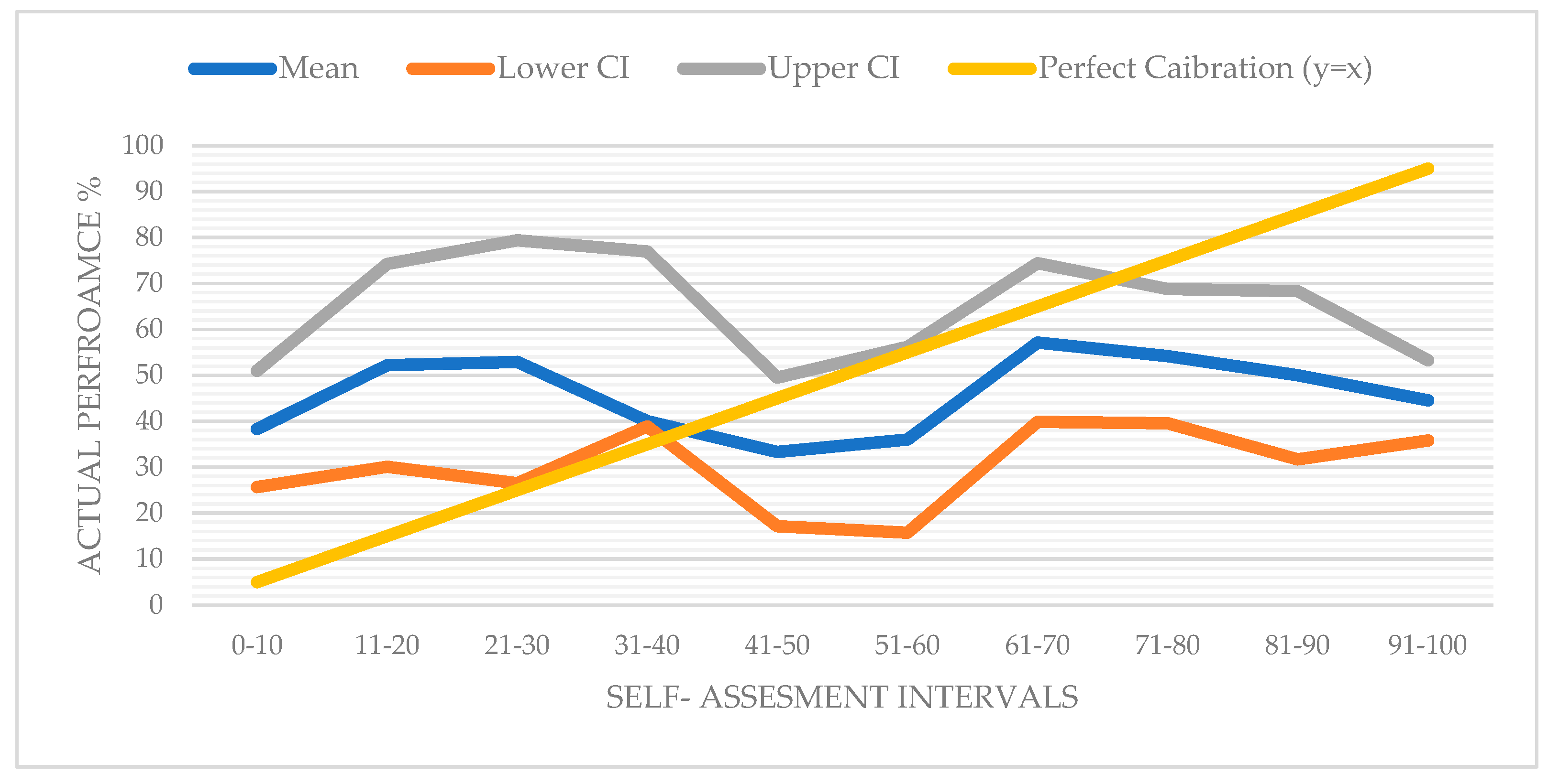 Figure 4) illustrates the relationship between self-assessment intervals and corresponding average accuracy scores. While a perfectly calibrated individual would exhibit a 1:1 correspondence between perceived and actual performance, the observed pattern deviates from this ideal. While some intervals (e.g., 31–40 or 61–70) show relatively accurate self-judgments, others exhibit substantial misalignment—particularly in the mid-range (41–60). This miscalibration pattern suggests the presence of overconfidence bias, wherein perceived performance systematically exceeds actual outcomes.